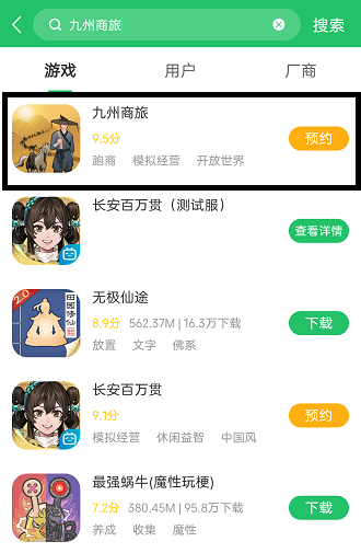 3、搜索后会弹出对应的搜索结果,点击其中的九州商旅结果进入游戏详情界面;