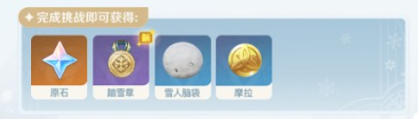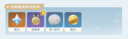 完成所有「觅踪特训」,每种「雪人部件」都至少能获得一件,除此之外还有原石、踏雪章、摩拉奖励。