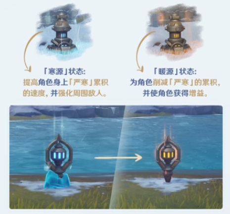 三个机关全部启动后,「诱饵装置」便会转变至暖源状态,为角色削减严寒的累积。