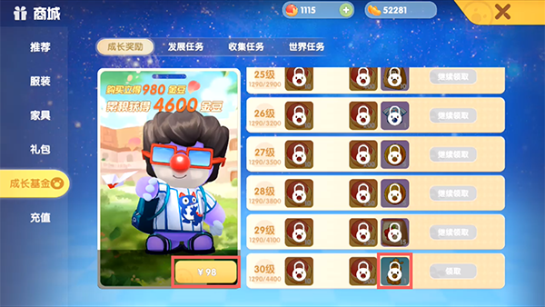 3.在左侧花费98元购买成长基金,当成长基金达到4400时,点击右侧的【领取】可获得;