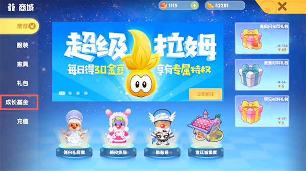 购买成长基金后,需要根据其“发展任务”、“收集任务”、“世界任务”等任务需求,完成任务领取成长经验,当经验值达到4400时,即可领取金色财神雕像。
