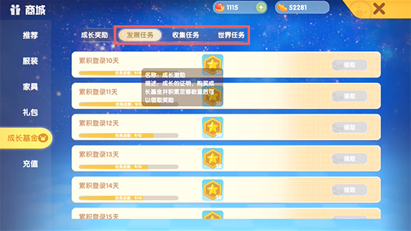 4.成长基金所需要的成长经验可通过【发展/收集/世界任务】来领取经验。