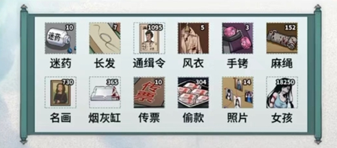 迷药、长发、通缉、风衣、手铐、麻绳 、名画、 烟灰缸 、传票 、偷款 、照片 、女孩