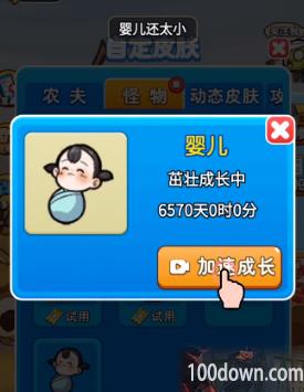 4、玩家点击打开皮肤界面,在怪物中找到婴儿皮肤,然后看视频加速成长,等婴儿长大就会成为小乔。