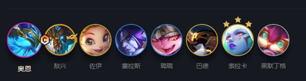 奥恩,塞拉斯和诺姆希顶前排。敖兴一般情况下缩角站就可以了。璐璐,佐伊都放敖兴旁边保护。璐璐稳定给敖兴加攻速。