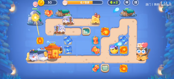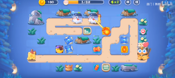 3、这一关有新兔子“花轿兔”,玩家要集火打一下,会出来兔子,可以在下方那条路旁边多放炮仗/火瓶炮,打的会快一点;