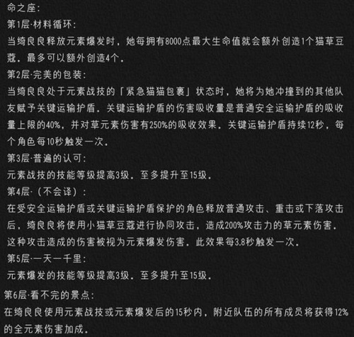 4命:在绮良良和队友身上都存在护盾的情况下,所有角色的普攻或重击都会召唤炸弹带来的协同攻击,冷却时间为3.8s。