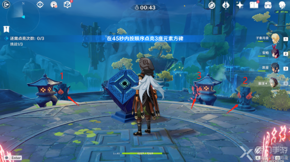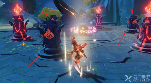 第一次:需要在45秒内按顺序点亮三个火石碑