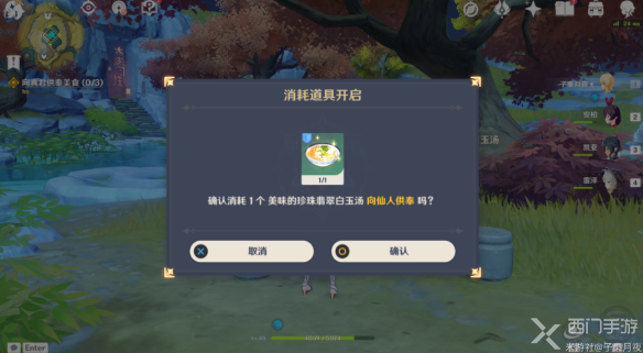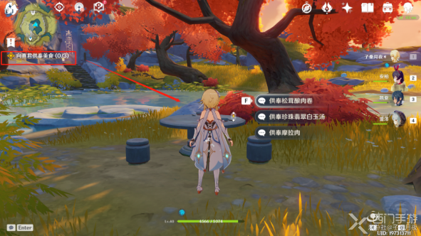 4、找完之后,回到湖中心的石桌,可以看到有三个供奉食物,分别是:珍珠翡翠白玉汤、松茸酿肉卷、摩拉肉;