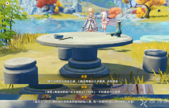 2、到达位置之后,靠近湖中心的石桌就会与派蒙对话,其中为了引起留云借风真君的注意,派蒙建议我们做点仙人喜欢吃的美食;