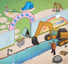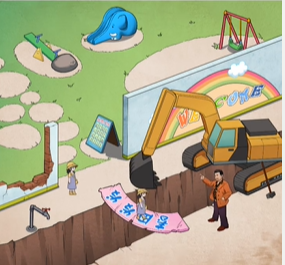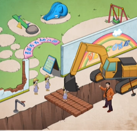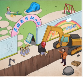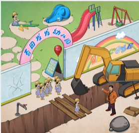 1、先是用锤子把墙砸了,把它当桥小朋友就过来了。