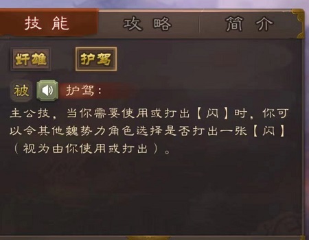 护驾--主公技,当你需要使用或打出【闪】时,你可以令其他魏势力角色选择是否打出一张【闪】(视为由你使用或打出)。