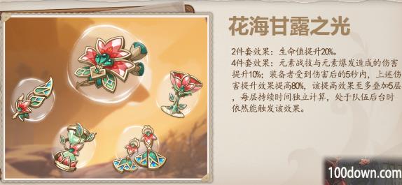4件套效果则是提升E技能和Q技能造成的伤害。初始提升值是10%,装备者在受到伤害后能进一步提升伤害加成效果,每层可以额外提升初始提升值的80%,至多叠加5层。所以说,当有5层时,花海4件套效果带来的EQ技能伤害提升值为50%,比一个圣遗物杯子的伤害加成略高一些,所以说提升数值其实是很高的。