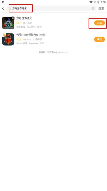 4.来到搜索的页面中输入【方舟生存进化】后在搜索的结果中点击【云玩】;
