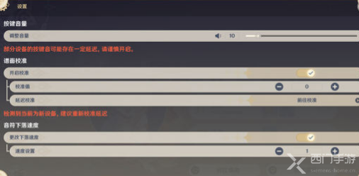 4、旅行者们可根据触击习惯,在设置界面调整音符下落速度和按键音量,以及进行谱面校准;