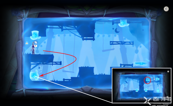 (这是先成图的第二个场景,靠近帽子交互就能解锁隐藏道路,左边的道路能顺便开一个宝箱,右边的就是出去的路)