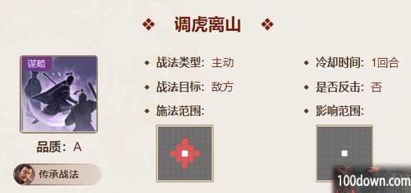 调虎离山:对敌军单体造成91%~182%谋略伤害,并令其向自身的反方向移动2格。