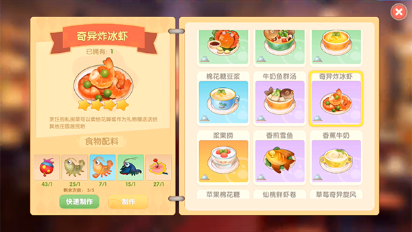 私房菜菜谱:奇异果*1、冰川虾*1、冰川红虾*1、鳌虾*1、毛毛花*1