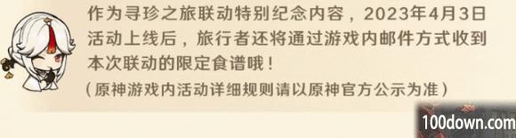 作为寻珍之旅联动特别纪念内容,2023年4月3日活动上线后,旅行者还将通过游戏内邮件方式收到本次联动的限定食谱哦!