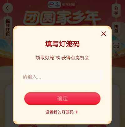 3.点击后进入输入灯笼码的界面,该界面用户可以输入上面的两个灯笼码进行使用,使用后即可领取自己没有的灯笼,用户也可以设置自己的灯笼码分享给好友。