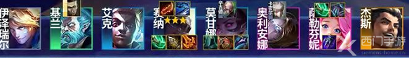 1、阵容成员:伊泽瑞尔+基兰+艾克+赛娜+莫甘娜+奥利安娜+萨勒芬妮+杰斯
