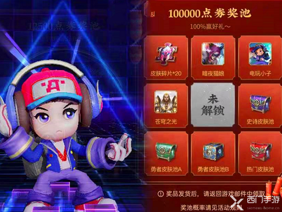 4.第四档是累充达到10万点券,可以在皮肤碎片*20、阿轲-暗夜猫娘、鲁班七号-电玩小子、项羽-苍穹之光、4个皮肤宝箱等奖励。这些奖励中有3款2888点券皮肤,抽中了就大赚了。