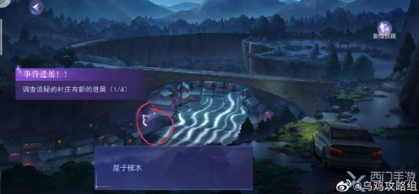 2、然后去调查上方的紫色“身手”,还有桥下左侧“观察”,河流右侧“观察,河流左侧,桥脚下那片房屋,把这些线索都拿到;