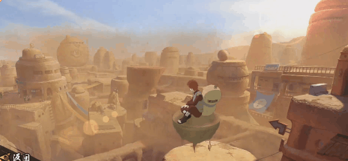 游戏中的砂隐村场景将近景设在楼顶,可将砂隐村的景色尽收眼底。在右侧有护栏的平台大家还记得是什么地方吗?这里就是我爱罗初次见到迪达拉的地方。