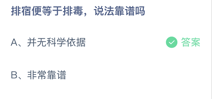排宿便等于排毒,说法靠谱吗?这是今日的蚂蚁庄园小课堂的问题,很多玩家都比较关注这个话题,接下来就让小编为大家详细介绍一下,希望可以帮助到大家。