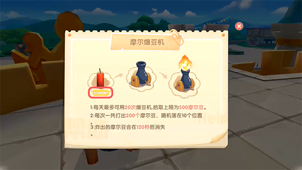 6.当爆竹投掷到爆豆机上之后,将会爆出摩尔豆,在120秒内找到10处摩尔豆,点击右侧的按钮捡起获得摩尔豆。