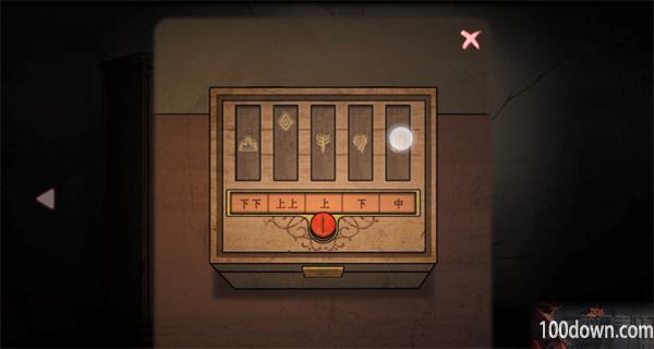 5、点击女人右边的木箱子,根据签筒里的线索调整符号高度,点击红色按钮调整签,密码如下图所示,打开盒子后拿走【蜡烛】。