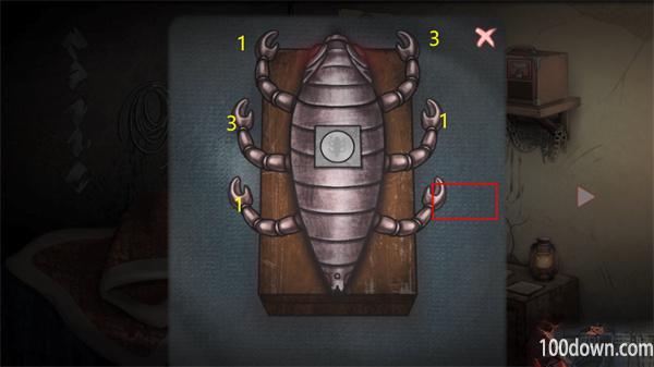 10、向左移动,阅读床头柜上的书本,把【寒铁蝎】放到床上的盒子上,根据书本上的内容,蝎子腿指向数字几就点击几下,下图有标记数字的简易版本,打开盒子拿走【钥匙】。