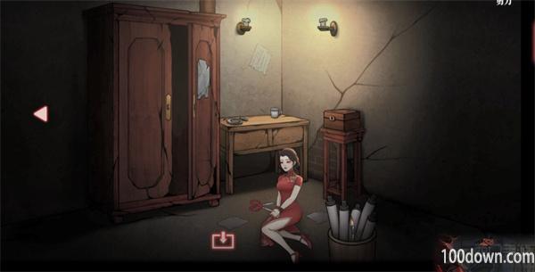 3、捡起女人右边的【毛笔】,桌子上的【空杯子】,最后点击柜子顶的竹筒。