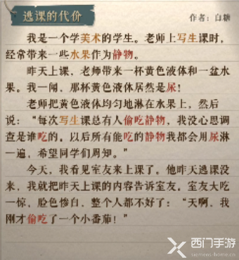 老师把黄色液体均匀地淋在水果上,然后说:“每次写生课总有人偷吃静物,我没心思调查是谁吃的,以后所有能吃的静物我都会用尿淋一遍,希望同学们周知。”