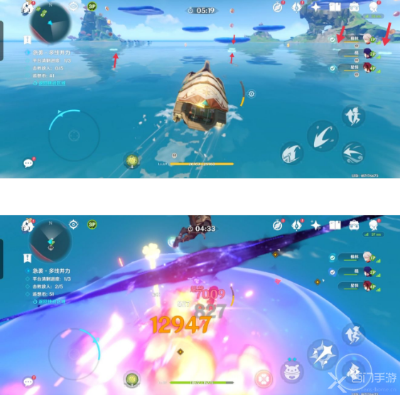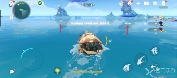 3、继续向南行驶,可以看到远处有数个停泊点(红色箭头所指方向)。这时我们只需要将浪船路过停泊点即可。经过所有停泊点(图中未全部标出)后,会自动开启风场(图四),这样就就可以打到最上层的怪物;