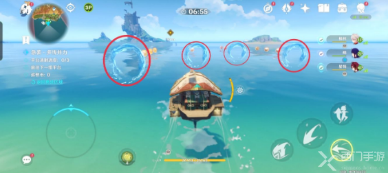 5、继续向南开船,合理利用蓝色水环加速,不合理的话,蓝色水环会让你加速退后!来到下一个大型停泊点,经过所有停泊点(图中未全部标出)开启风场,消灭怪物;