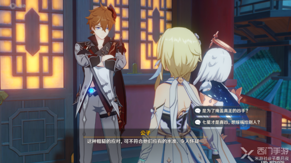8、最终可以走到黄标位置,但是还是会被发现,这个时候公子会初次出场帮我们摆脱千岩军的追捕,并且让玩家去北国银行,须知璃月古谚:隔墙有耳;
