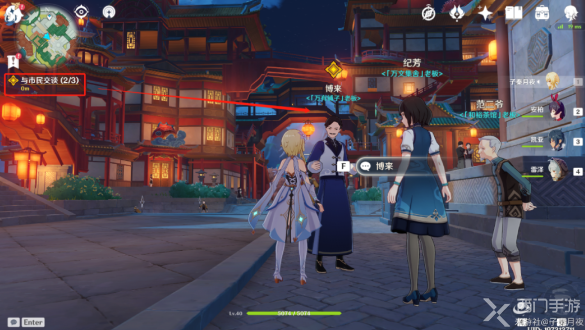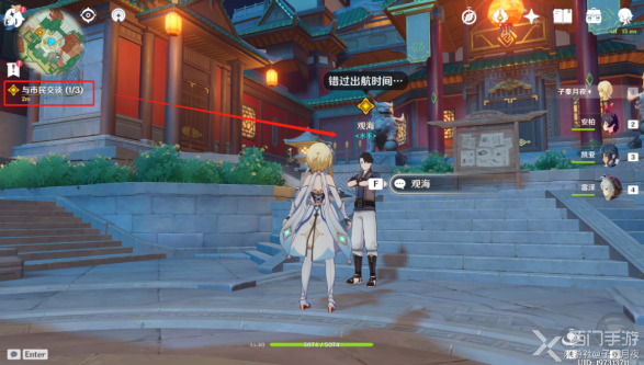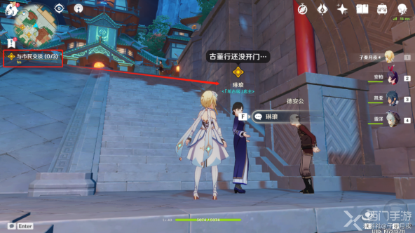 2、首先玩家需要和三位市民交谈,分别是:希古居店主琳琅、水手观海、万有铺子老板博来,玩家与博来对话完就会指引前往玉京台,那个港口最高点;