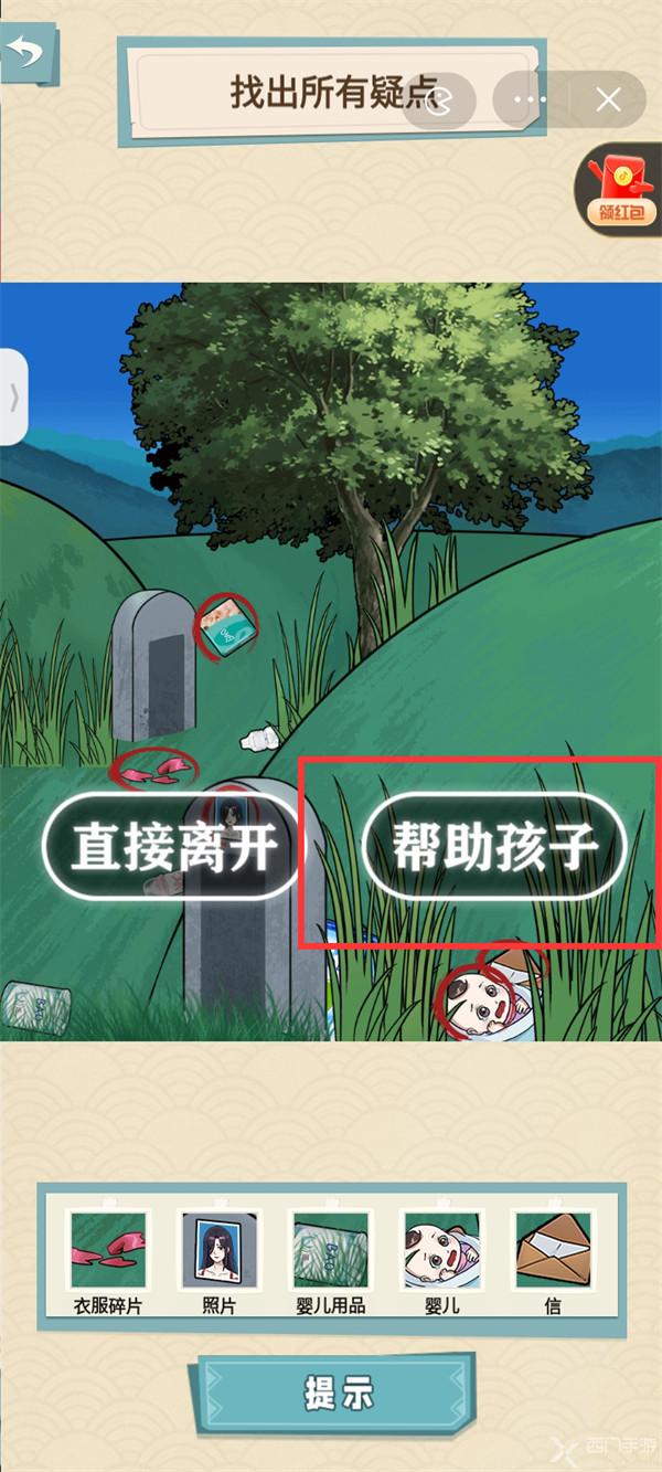 3.选中衣服碎片、照片、婴儿用品后,向左滑动下方的草露出婴儿,点击婴儿之后点击婴儿旁边的信,选择【帮助孩子】;