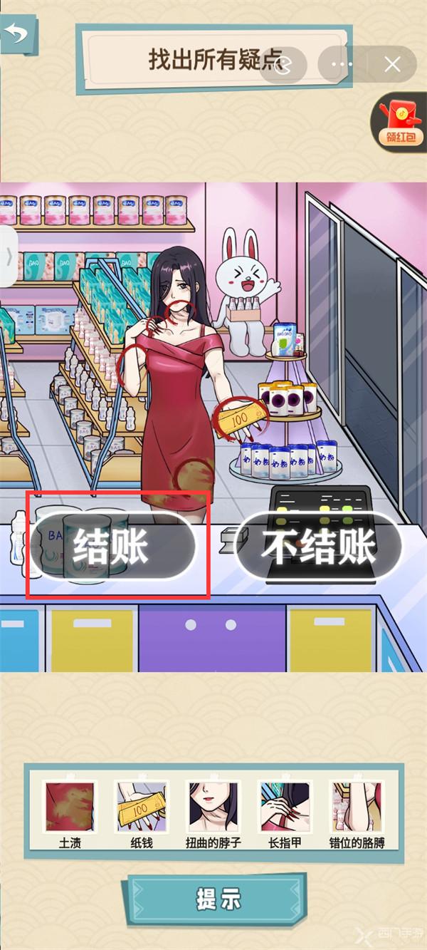 1.女人身上的土、手上的钱、脖子、胳膊、手上的指甲,选择【结账】;
