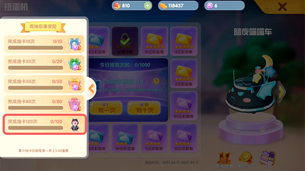 在云彩扭蛋机中,每周累计抽奖120次,就可以通过周抽扭蛋奖励领取获得到这套动感夜光服装,需要注意的是,每周一的早上5点会重置抽奖次数,所以大家需要在周一的5点前完成累计抽奖并领取奖励。