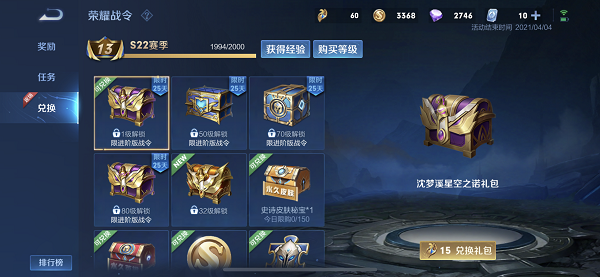 打开游戏,找到右侧的【荣耀战令】,点击左侧的【兑换】,就可以使用战令来兑换进阶版战令礼包,其中包含了鲁班和李元芳的战令皮肤,以及诸葛亮、王昭君的星元皮肤等奖励。