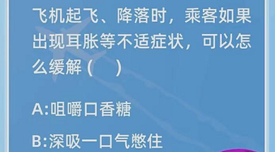 飞机起飞降落时乘客如果出现耳胀等不适症状,可以怎么缓解?这是今天的蚂蚁庄园每日问题,很多用户都想知道这个问题的具体答案,小编第一时间就为大家带来关于这个方面的最新消息,一起来看看吧。