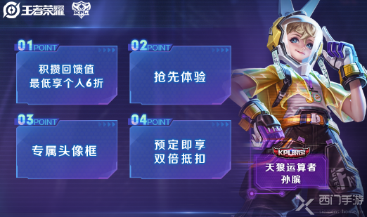 获取方式:预定即可抢先体验皮肤,并获赠KPL专属头像框,正式购买时享定金双倍抵扣~参与活动积攒回馈值,还可解锁个人专属6折特权和荣耀积分好礼。