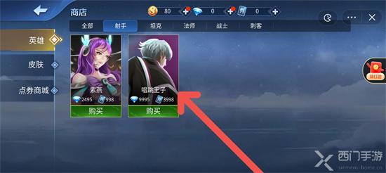 4、点击英雄行列里的【射手】选项,在这里就可以的发现【坤坤】英雄,即【唱跳王子】英雄,花钱购买它即可获得【坤坤】。