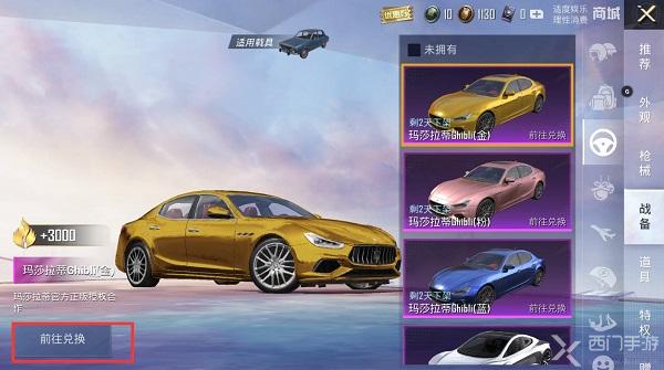 四、在该界面就能够看到玛莎拉蒂皮肤了,点击下面的【前往兑换】选项即可进入兑换界面,输入上方的兑换码即可兑换玛莎拉蒂皮肤了。
