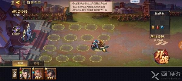 根据强盾篇给出的布局提示得知,对方阵容的董卓可以通过牺牲士兵回复自身生命,徐晃还可以大幅提高士兵输出,也就是说我们需要快速消灭掉敌方士兵,避免董卓回复生命值、徐晃提高士兵输出,那么就需要使用到张飞,因为张飞大范围伤害使士兵逃跑,不仅可以攻击还可以回复生命,和其可用主将相比,使用张飞是最好的。