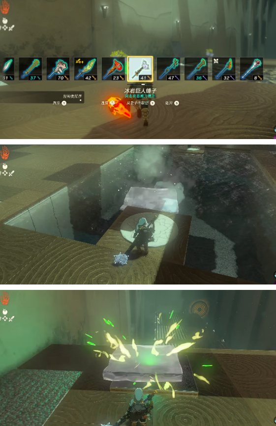 4、进来后先用冰岩巨人锤子将水池左边的浮块变为冰块,并放在后面的台子上,然后对准下面的靶子滑下去就行,一定要击中才可以触发开门的机关;