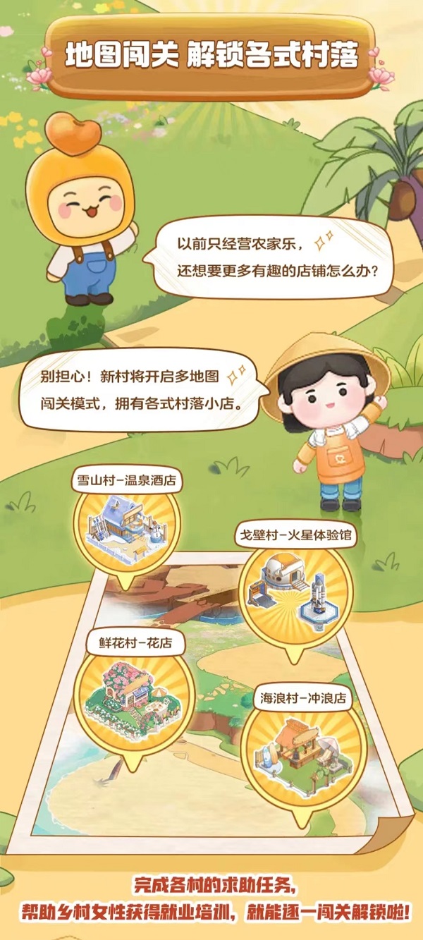 3、完成助力之后,会有闯关内容,闯关内容就是完成全新推出的不同村庄的任务,助力乡村女性获得就业培训,就可以逐一解锁村庄;