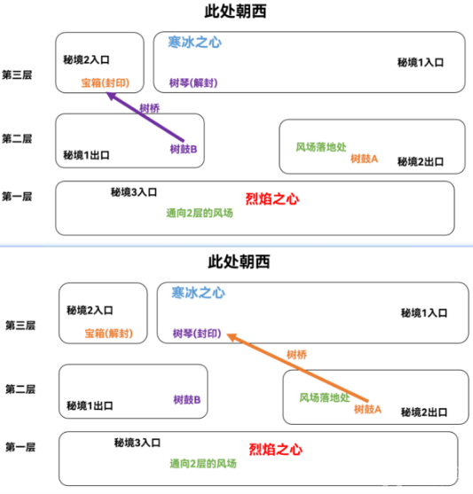 (1)秘境2出口的树鼓A可以让树桥通向寒冰之心,但会让解开最终宝箱的树琴被封印。
